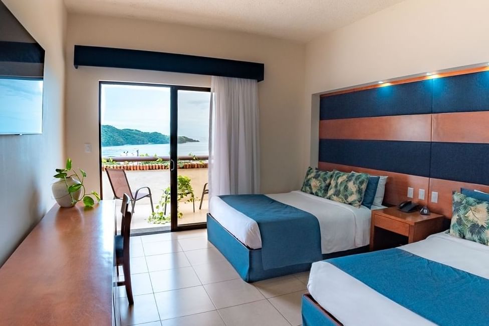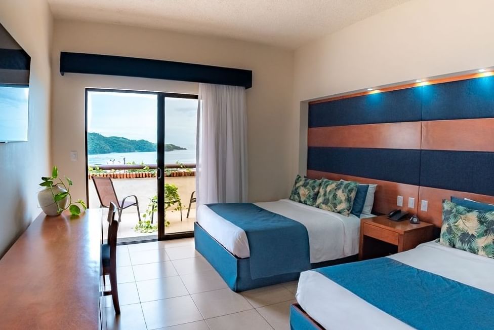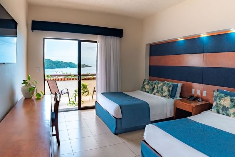 This room is equipped with two queen-size beds and a large terrace/balcony with ocean views. They also have a desk area, chairs, a large closet, a bathroom with a rain shower, and personal amenities. These rooms have a sliding glass door that gives you easy access to the balcony/terrace and are located at a very convenient distance from our main social areas.